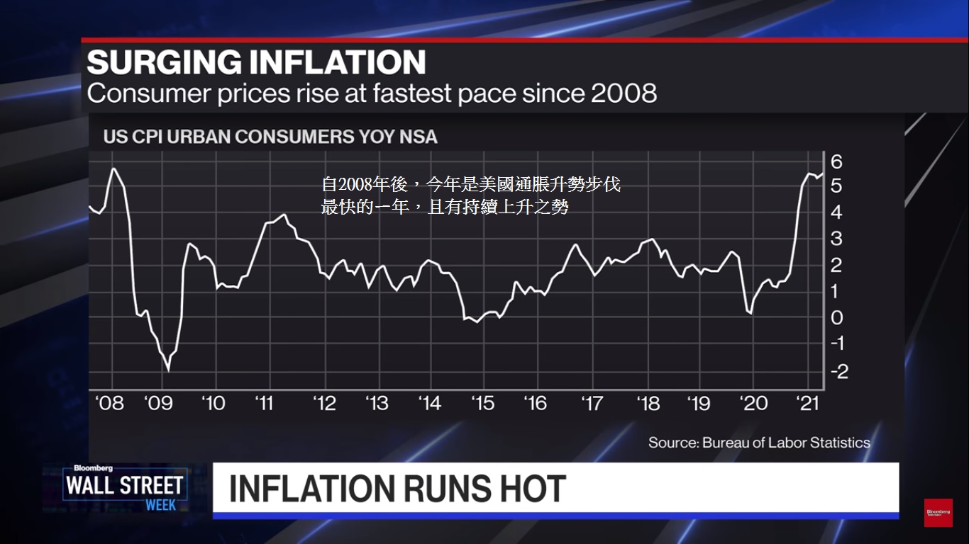 前週美國前財長薩默斯(Summers)接受彭博新聞訪問時說 : 「美國現時的高通脹根本是長久性的,聯儲局應盡快動用措施內來壓抑通脹。」 他暗示11月才進行減少買債還是太遲。美國通脹升勢如何急速 ? 可參考[圖一],圖中可見,自2008年後,今年是美國通脹升勢步伐最快的ㄧ年,且有持續上升之勢,看來聯儲局快將「收水」的行動,似乎是勢在必行,問題是每月減少買債的額度多與少。