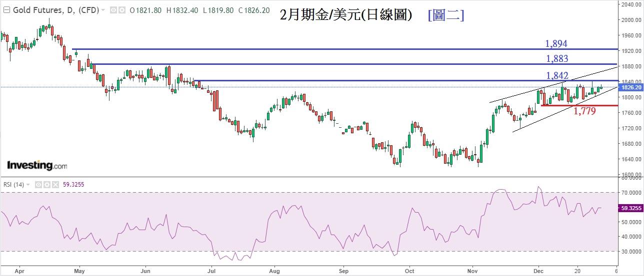 技術分析方面,見下方[圖二] 2月期金/美元(日線圖), 金價仍走在上升通道之內,本週預計金價仍然向上發展。